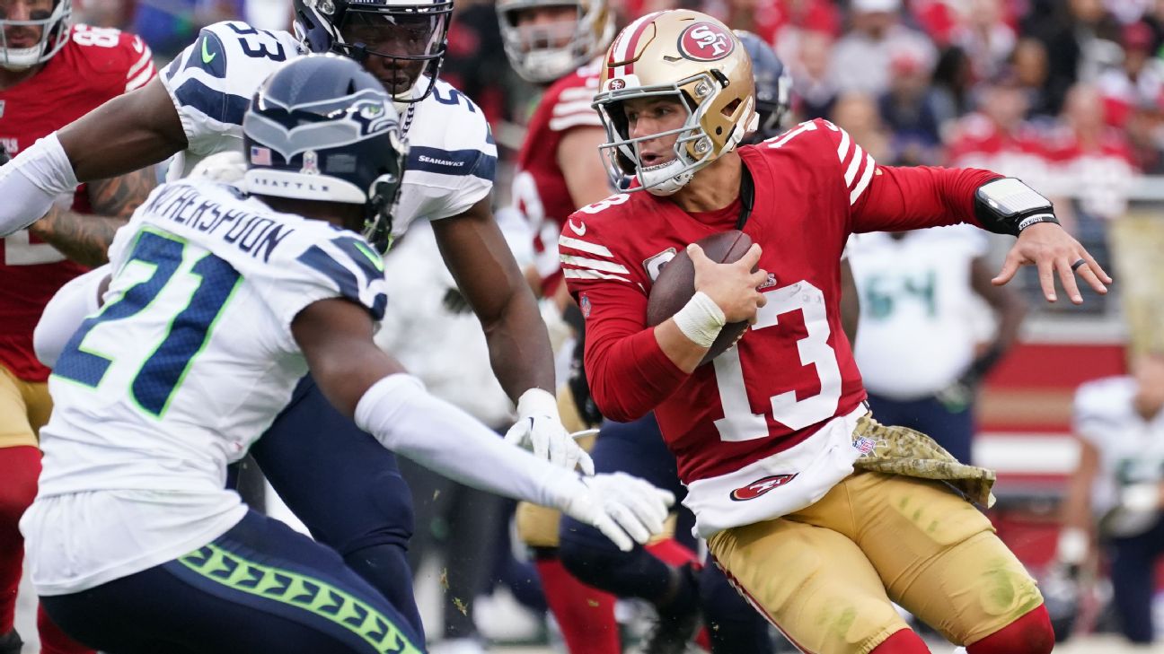 Purdy was 21-of-28 for 159 yards with a touchdown and an interception against the Seahawks while being sacked twice. He also rushed five times for 40 yards and a touchdown where he took some additional hits.