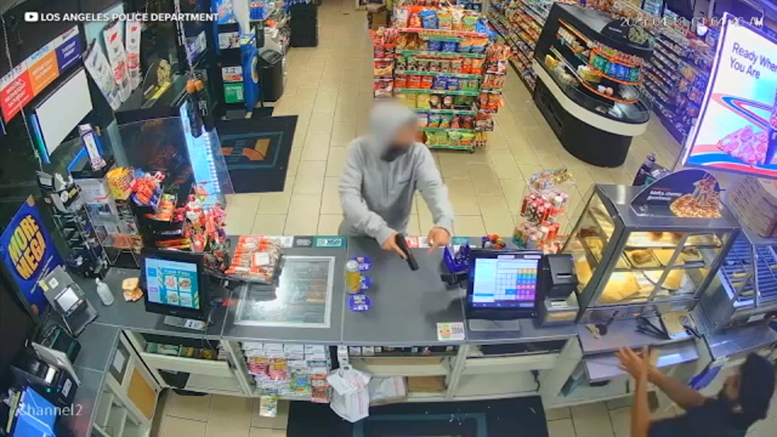 Surveillance video shows a suspect in a gray hoodie pointing a gun at the store clerk demanding money at one location. In the video, the gunman can be heard telling him to relax and saying "I just want the money."