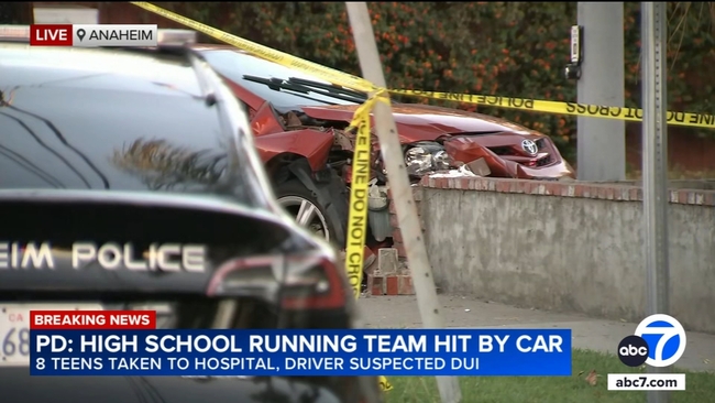 ANAHEIM, Calif. -- Eight students of a high school running team in Southern California were injured after a suspected DUI driver plowed into them during a training run Wednesday afternoon, police said.
