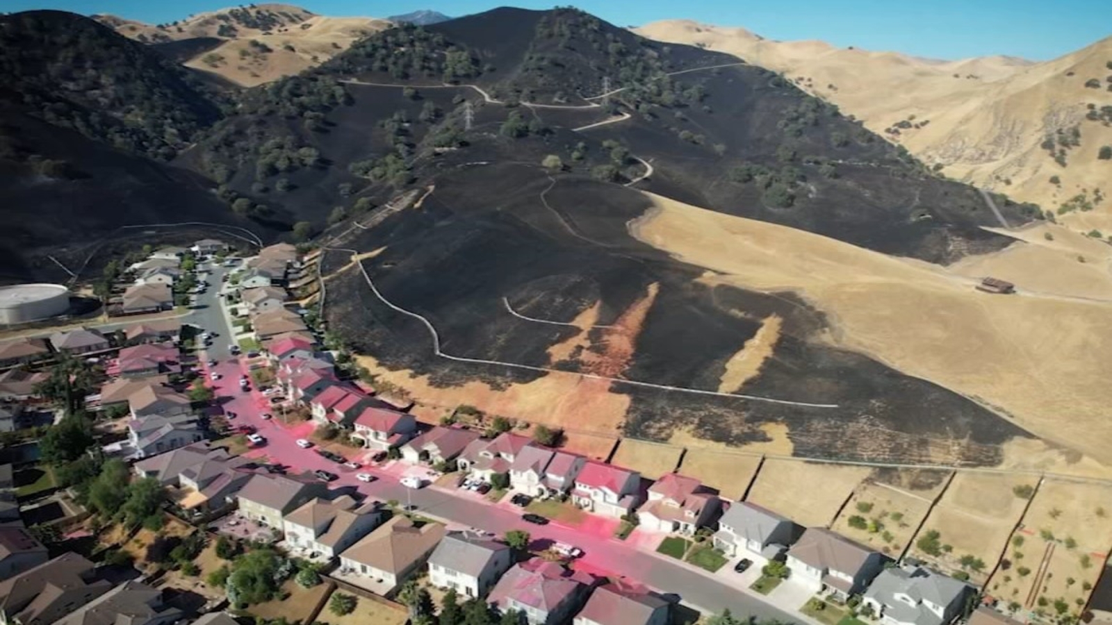 Drone video shows the burned hills frighteningly close to homes and the pink fire retardant that firefighters used to save them. The retardant is now covering the street and a row of homes in the neighborhood.