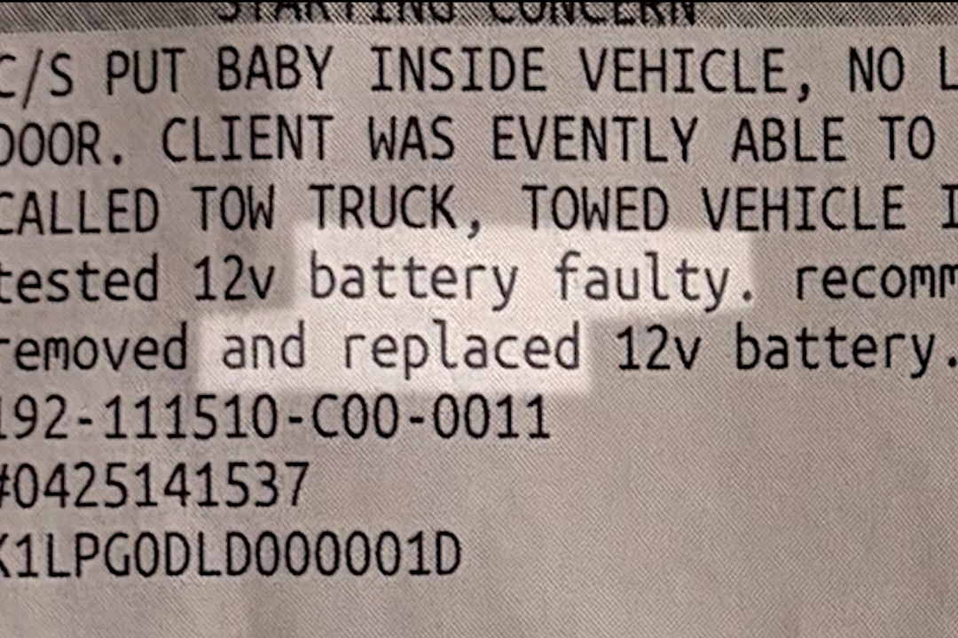 A service receipt shows the car's 12-volt battery was tested and determined to be faulty and replaced. The OnStar diagnostic report also listed electrical issues. Tinoco says a technician told her it caused the electrical system to go dark and into lock mode.