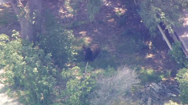 Police said its helicopter overhead may have caused the bear to go back into the woods, but the animal was later spotted under the shade of a tree near some homes.