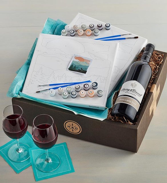 This sip and paint gift basket works for a wide variety of people. It's great for singles and couples alike, as there are options offering a single pre-printed canvas and tray or a set with two. Included also are paintbrushes and a bottle of Harry & David Ross Lane Red blend. Both skilled and new artists will have a great time painting and unwinding with this basket.