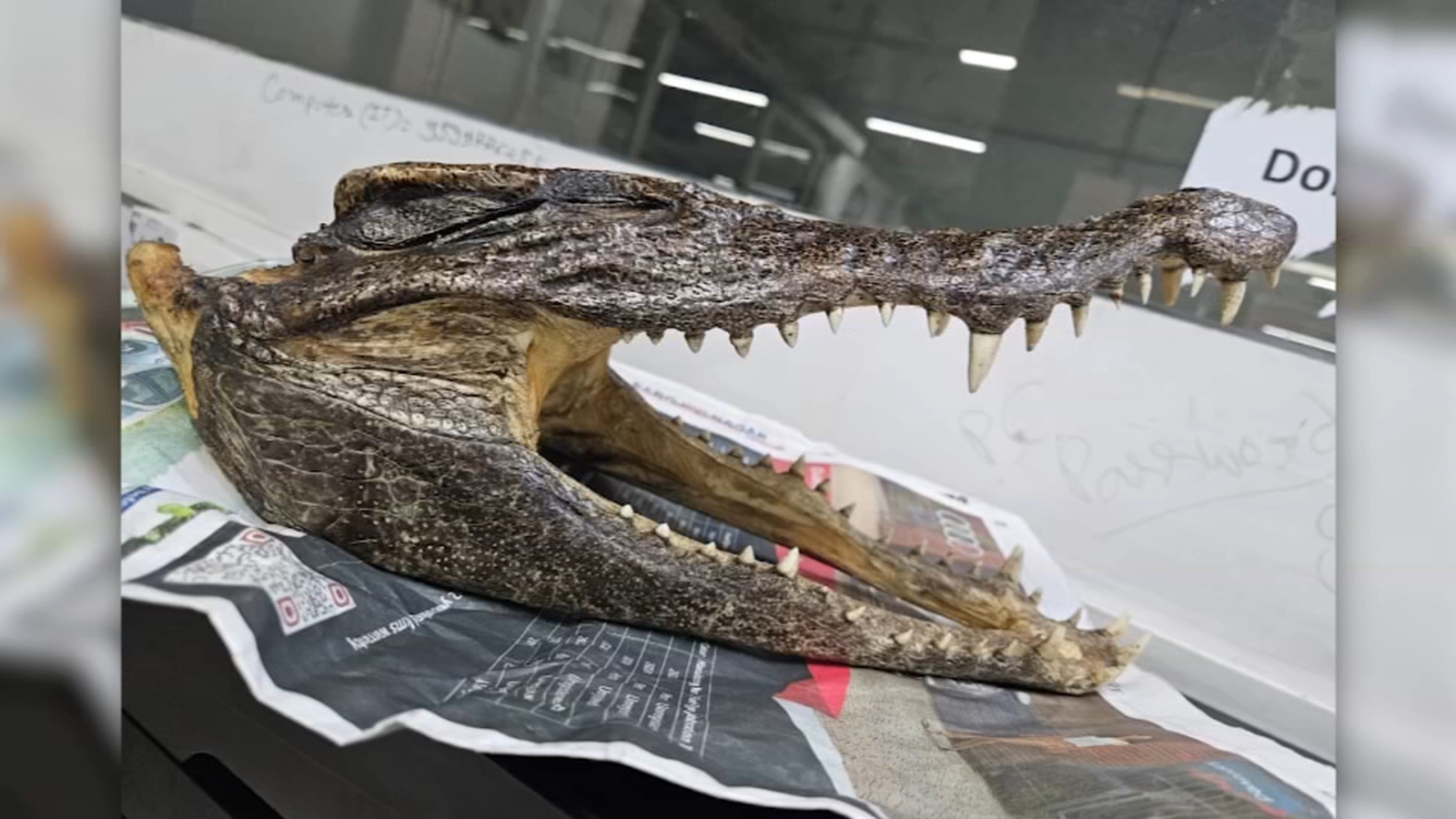 "Upon examination, a skull with sharp teeth, resembling the jaw of a baby crocodile, weighing approximately 777 grams, was discovered wrapped in a cream-colored cloth," Delhi Customs said in a X statement on Thursday.