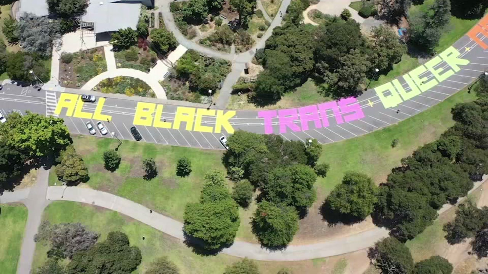OAKLAND, Calif. (KGO) -- Near The Gardens at Lake Merritt, the words, "All black trans queer nonbinary women's disabled imprisoned lives matter" are painted on the Oakland street.