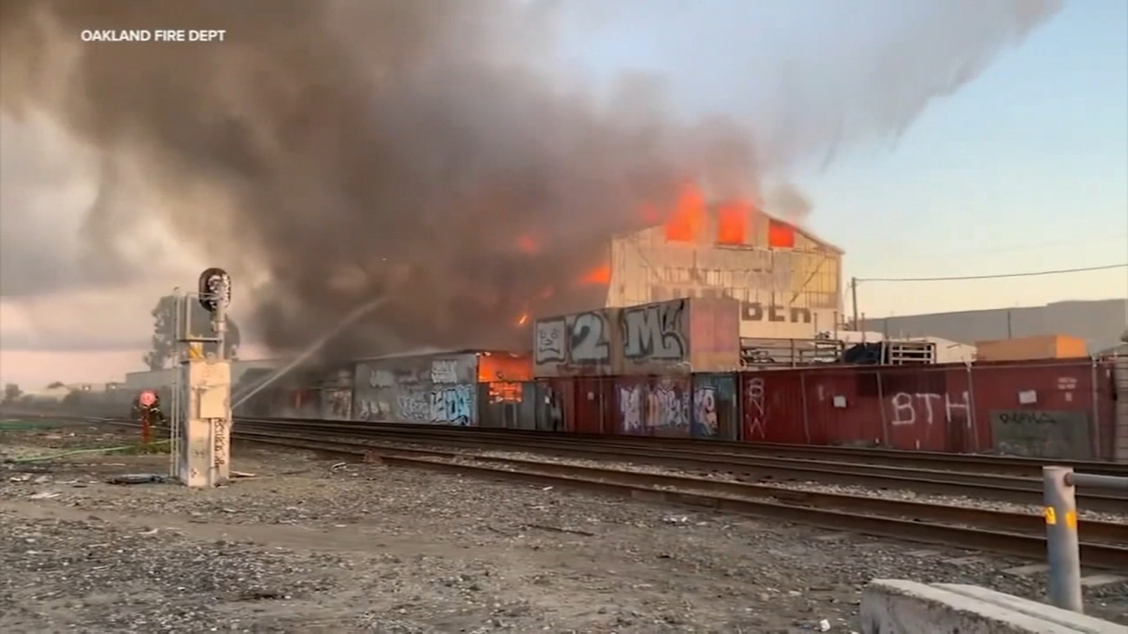 Flanked by a gas station on one side and railroad tracks on the other, Oakland firefighters quickly called for this lumberyard fire to be four alarms, bringing more than 100 firefighters to the scene.