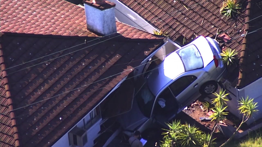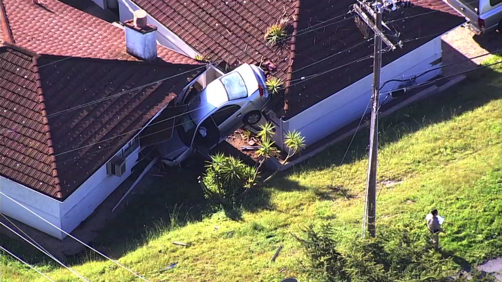 Residents in the Hayward neighborhood woke up to the strange scene -- a Honda sedan on top of a home after going air born.