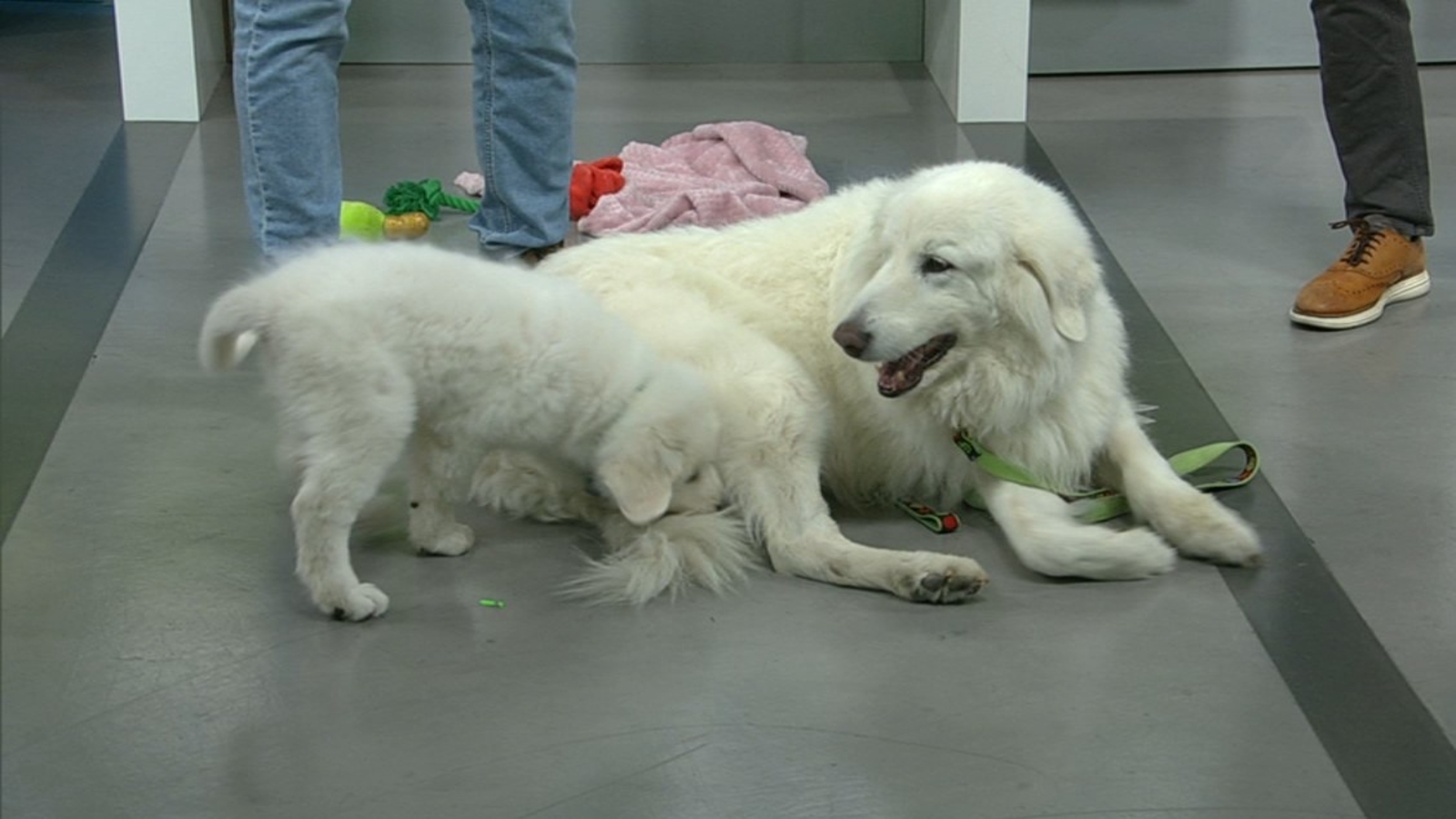Stella, a Maremma Sheepdog, and her energetic cloned puppy counterpart, Mella, visited the studio on Tuesday.