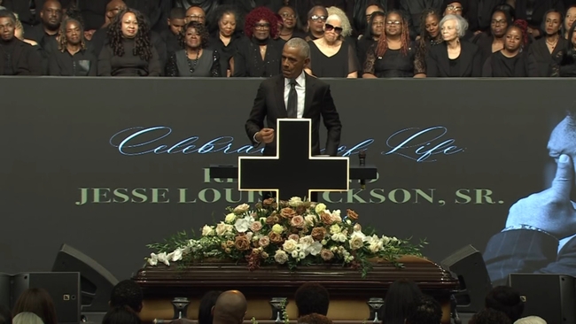 "But this man Rev. Jesse Louis Jackson, inspires us to take a harder path, his voice calls on each of us to be heralds of change," Obama said. "How fortunate we were that Jesse Jackson answered that call, what a great debt we owe to him. May God bless, Rev. Jackson. May he rest in eternal peace."
