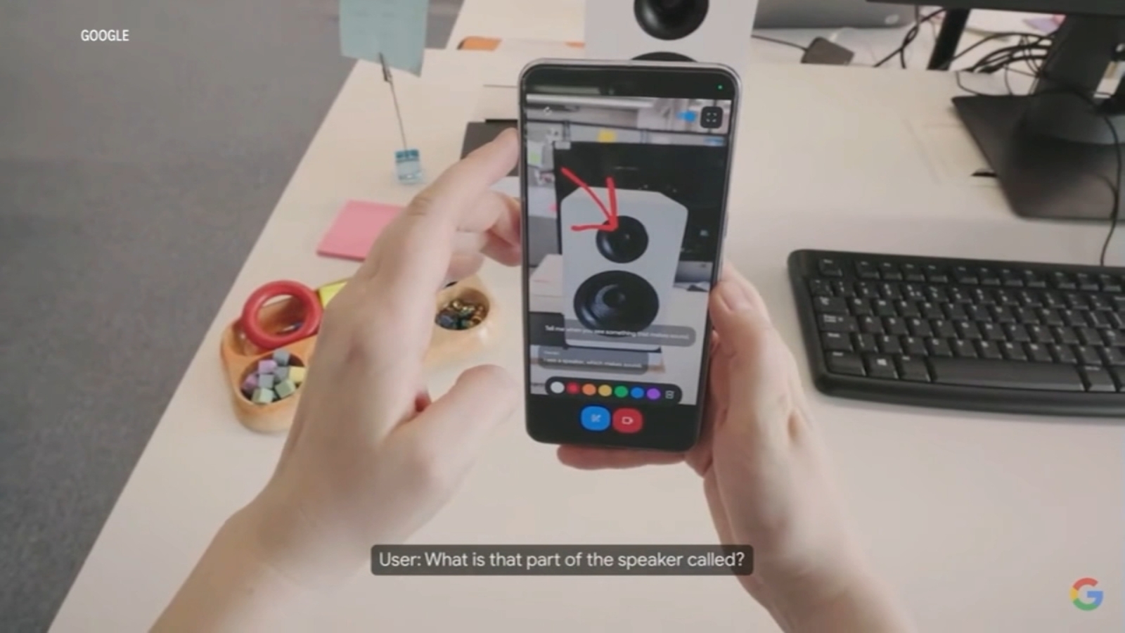 One video shared by the tech giant showed a user pointing a phone's camera at a computer speaker, pointing to its components and asking the technology to define it.