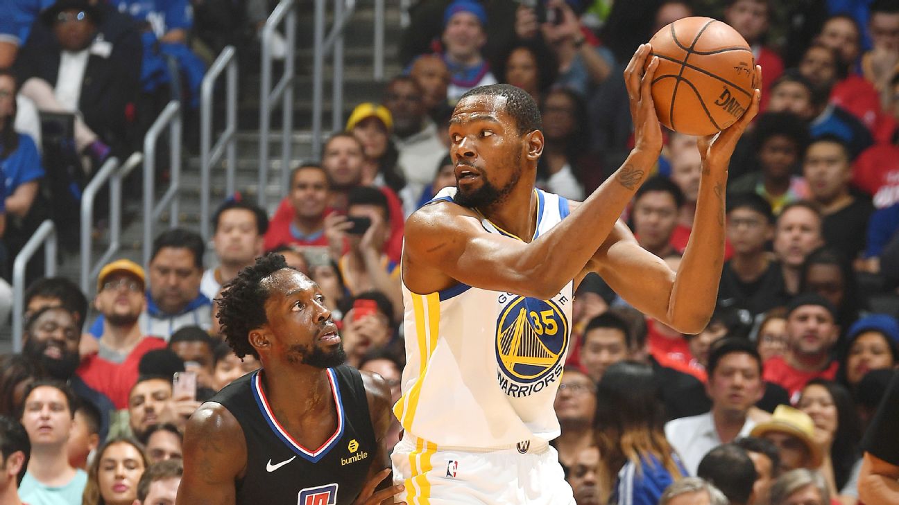 Durant hit all of his first five shots, scored or assisted on 51 percent of Golden State's 73 points in the first half, and put to rest any notion that pesky Clippers defender Patrick Beverley had gotten into his head by making 3 of 4 shots when defended by Beverley. According to Second Spectrum tracking, Durant has 9-of-13 shooting (69 percent) when defended by Beverley in this series.