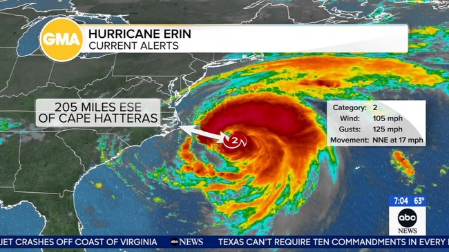 It remained a Category 2 hurricane early Thursday with maximum sustained winds around 105 mph (165 kph), the hurricane center said. Erin was about 205 miles (330 kilometers) east-southeast of Cape Hatteras and moving north-northeast at 17 mph (28 kph).