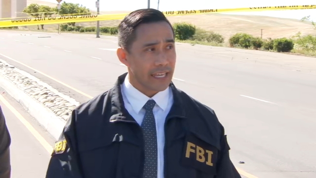 FBI agents were seen examining evidence markers placed across the roadway, including a bumper believed to be from the suspect's vehicle.