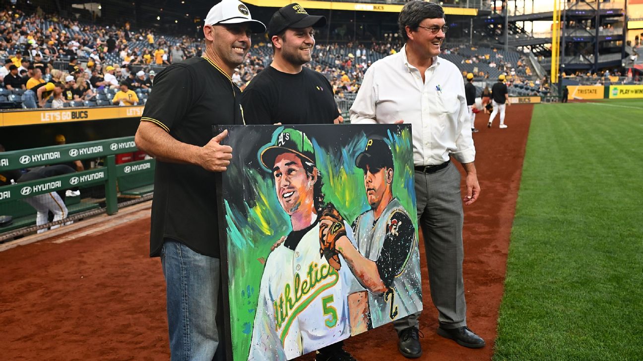 PITTSBURGH -- Former Pirates shortstop Jack Wilson threw out the first pitch Friday to his son, Jacob, who plays the same position for the Athletics as they revisited a similar scene from 19 years ago.