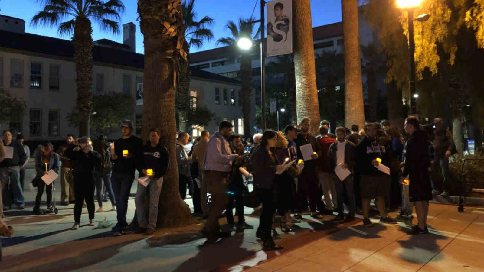 SJSU student, Spencer Brodie organized a vigil, held on-campus at the Cesar Chavez arch near 7th Street and San Fernando, Monday night.