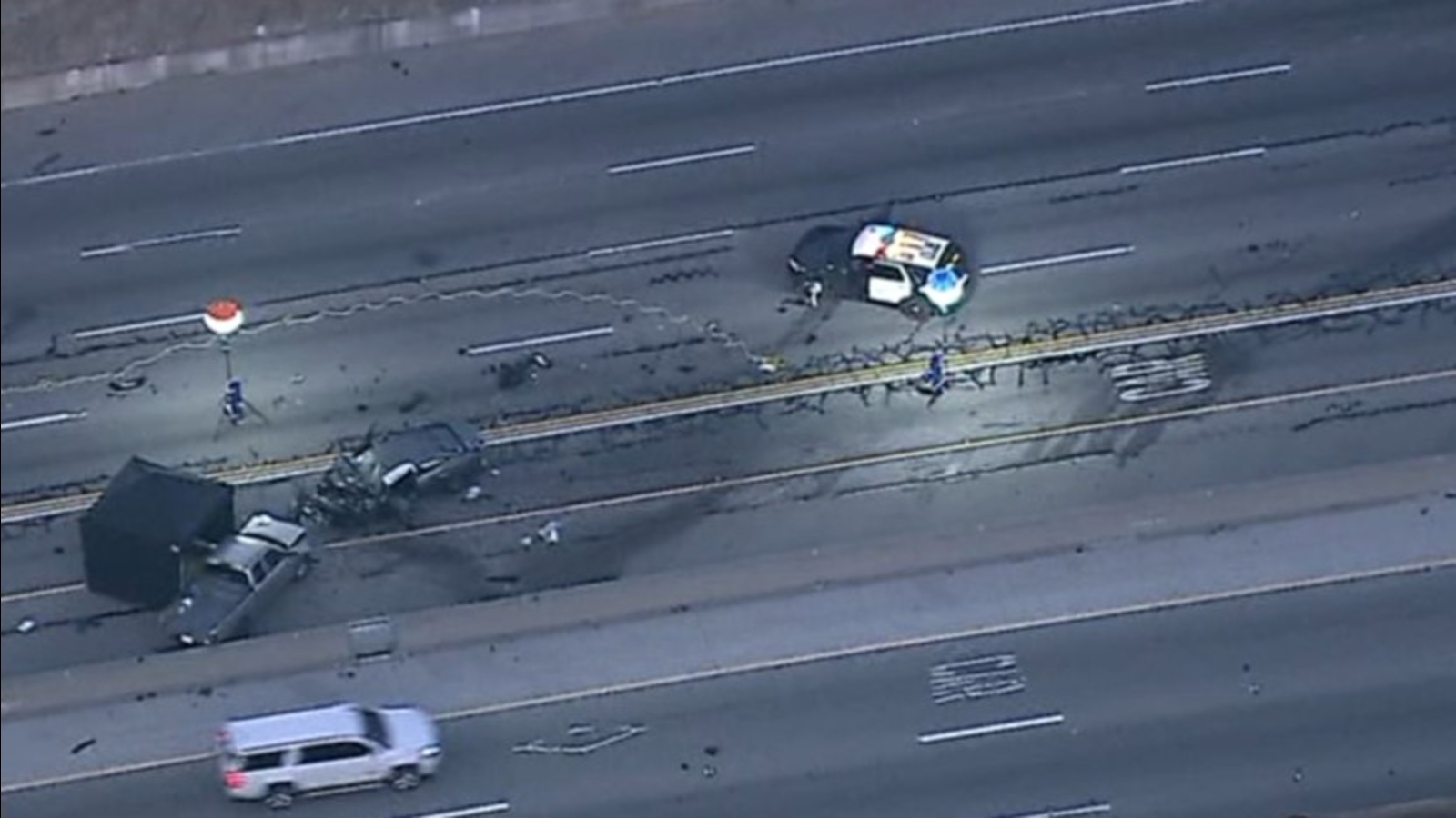 ABC Los Angeles affiliate KABC's helicopter was over the scene, where a marked LAPD vehicle was seen with damage to the driver-side door. Several other damaged cars were seen strewn across freeway lanes.