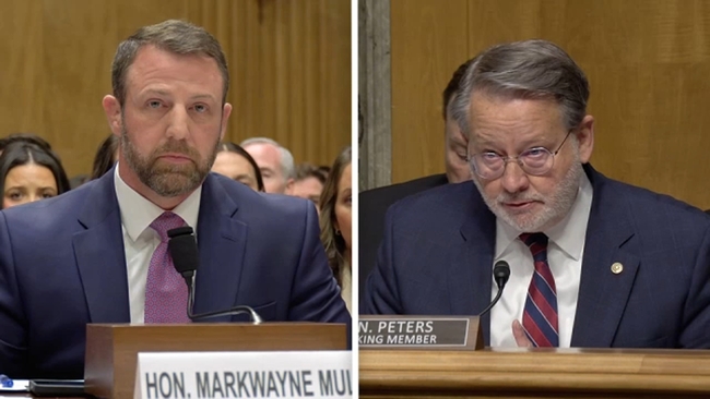 Peters asked Mullin, who is not a veteran, about his comments to Fox News earlier this month where he suggested he knows what war "smells" like. Mullin admitted to Peters that he had never been out of the country for anything other than mission work and vacations.