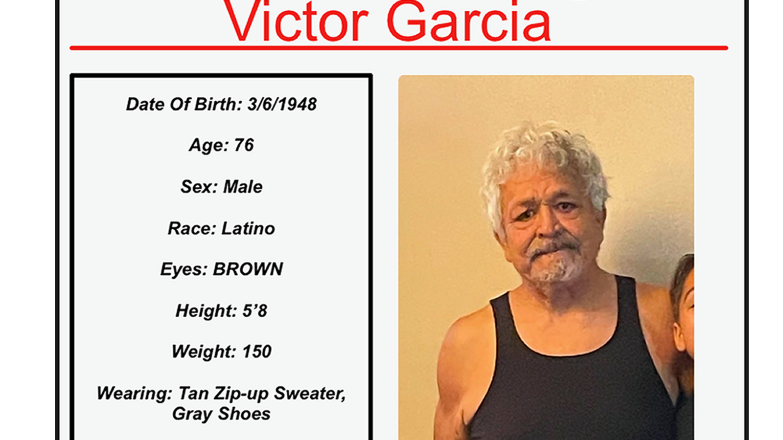 He is described as Latino, 5 foot 8, weighs 150, with gray hair. He was last seen wearing a tan zip-up sweater and gray shoes.