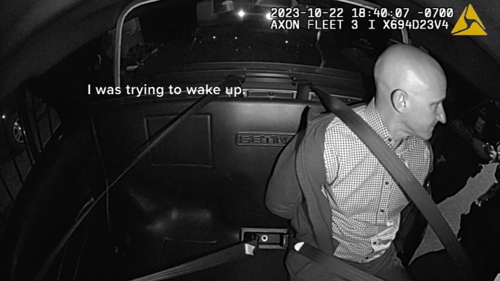 Video shows an interaction with an officer from the back of a police vehicle.