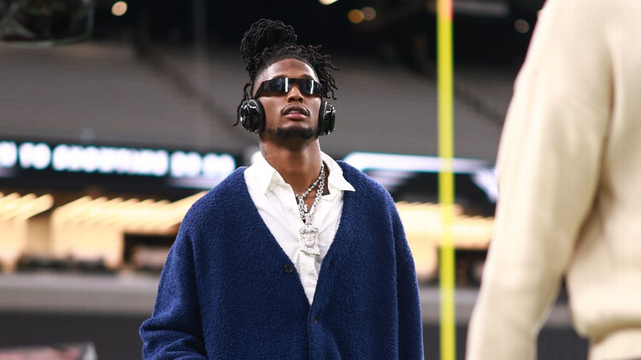 Dallas Cowboys wide receiver CeeDee Lamb opted for a casual look in his "Monday Night Football" arrival against the Las Vegas Raiders. Lamb sported team colors, wearing a navy blue cardigan over a white button up shirt with denim pants, alongside a statement chain and sunglasses.