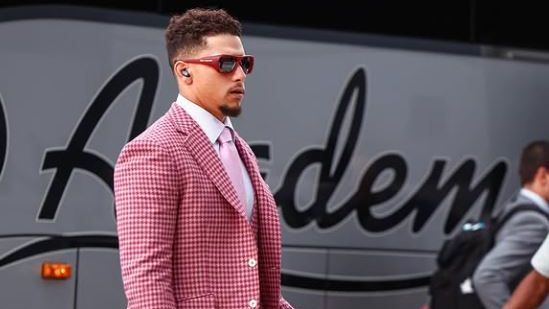 In Jacksonville to face the Jaguars on "Monday Night Football," Kansas City Chiefs quarterback Patrick Mahomes opted for a sleek red three piece suit.