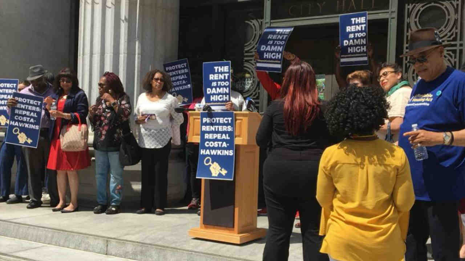 With signs that read "rent is too damn high," housing affordability advocates rallied in the front steps of Oakland City Hall to call for an end to California's rent control law.