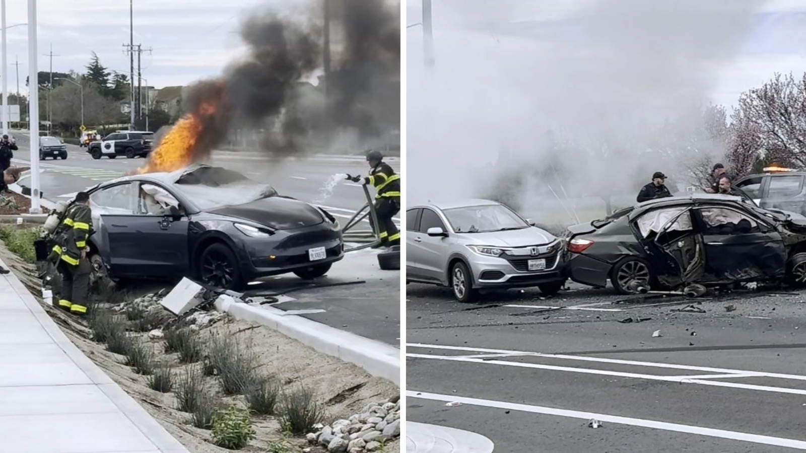 Surveillance footage shows the driver of a gray Honda sedan running a red light on O'Hara Avenue as a black Tesla on Laurel Road moves through the intersection. The cars collided and the Tesla burst into flames. The stolen car also hit a Honda SUV. Moments later, the Oakley police truck that had been pursuing the Honda approached the intersection.