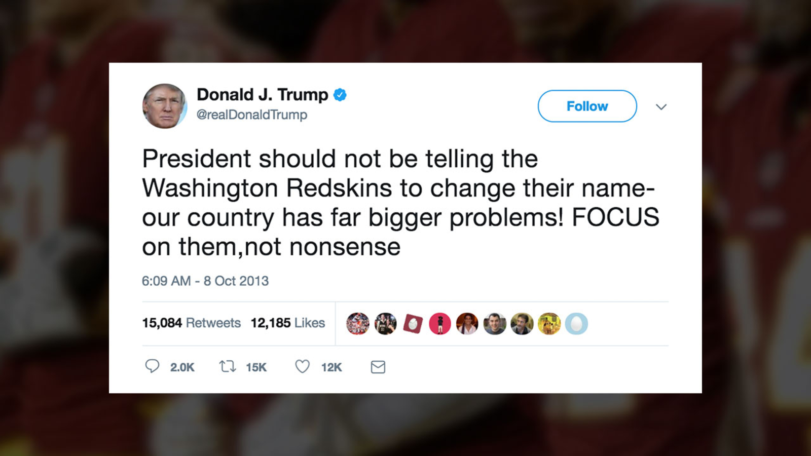 "President should not be telling the Washington Redskins to change their name," he wrote in a tweet at the time. "Our country has far bigger problems! FOCUS on them,not nonsense."