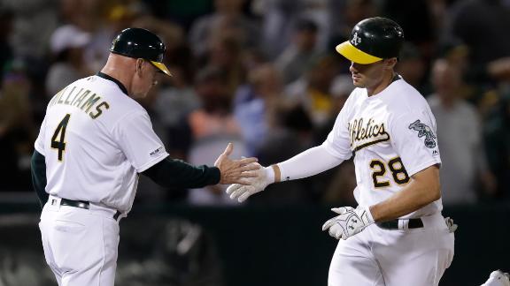 Olson's drive to center reached the Coliseum seats above the luxury suites -- a spot only a handful of sluggers have visited. Jorge Lopez (4-8) then hit Mark Canha with a pitch before Brown doubled.
