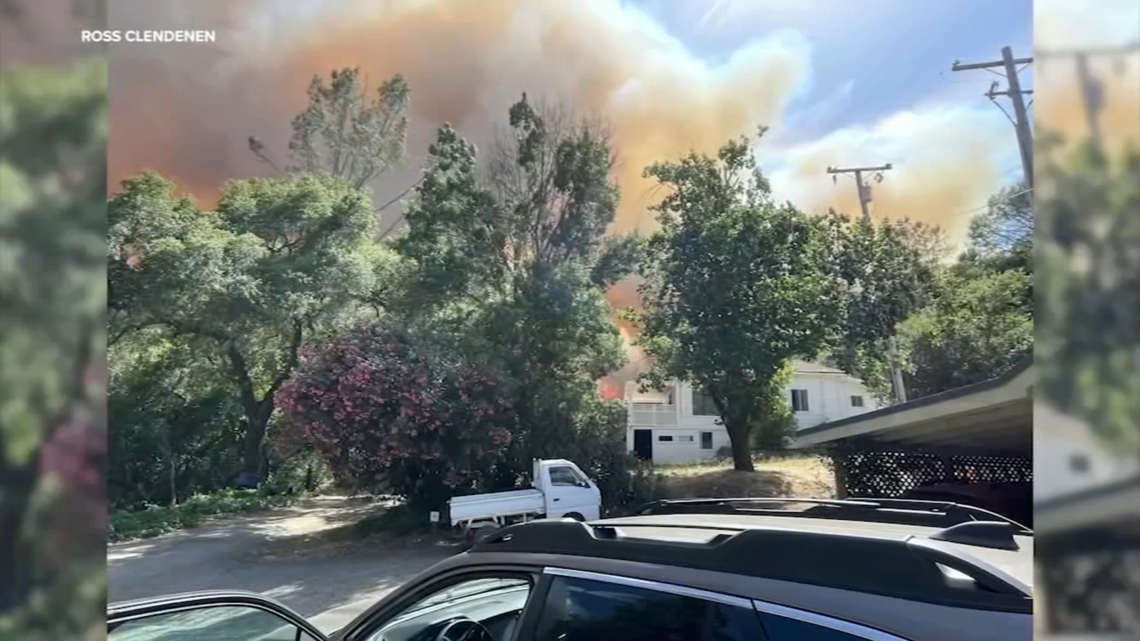 Their son Ross took pictures of the fire marching toward the family home but firefighters, were able to run defense on the flames yards away..