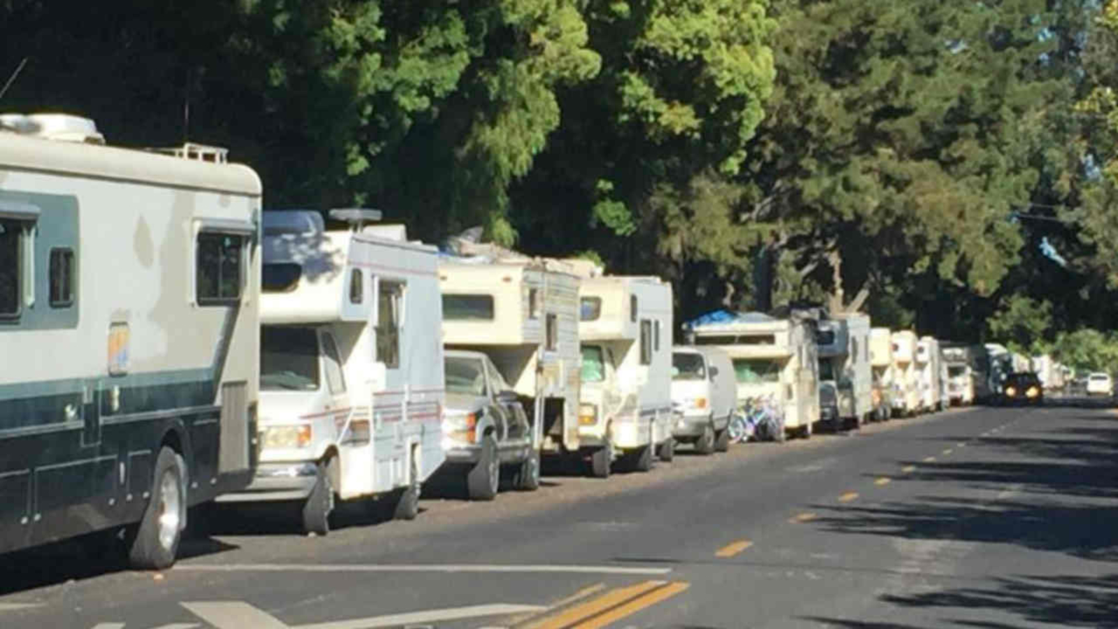 Dozens of RVs and cars line Crisanto Avenue next to Rengstorff Park in Mountain View.