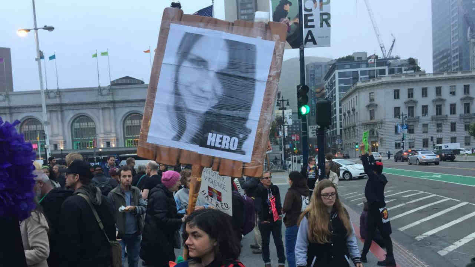 One woman carried a sign that said "hero" with a picture of Heather Heyer, the protester killed by a speeding driver.