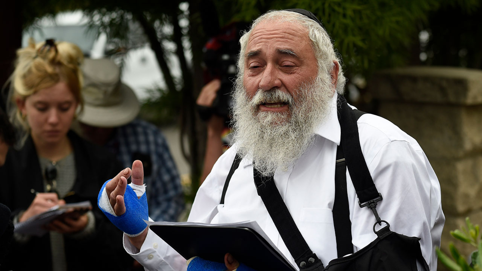 Rabbi Yisroel Goldstein detailed the events of Saturday morning in an emotional press conference outside the synagogue Sunday afternoon. Goldstein was preparing for his sermon when he heard a loud bang. He walked out into the temple's lobby, where he encountered the gunman and worshipper Lori Kaye, who had been fatally shot.