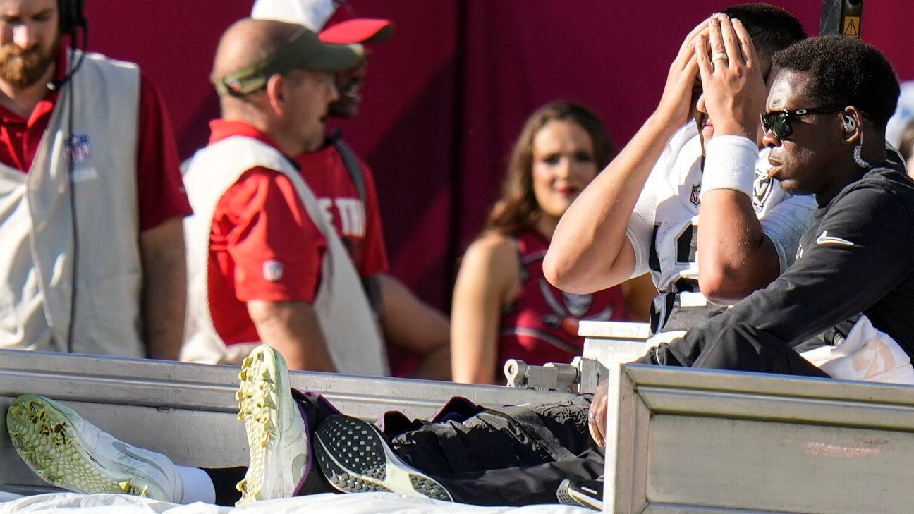Raiders quarterbackAidan O'Connellwas carted off the field late in the third quarter of Las Vegas' 28-13 loss at Tampa Bay on Sunday with a knee injury.