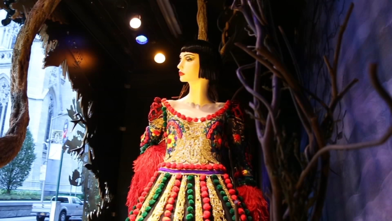 However, Saks will not abandon its tradition of displaying some classic high-end designs this holiday season. The 49th and 50th street windows feature several custom-made ball gowns for "a 21st-century Snow White."