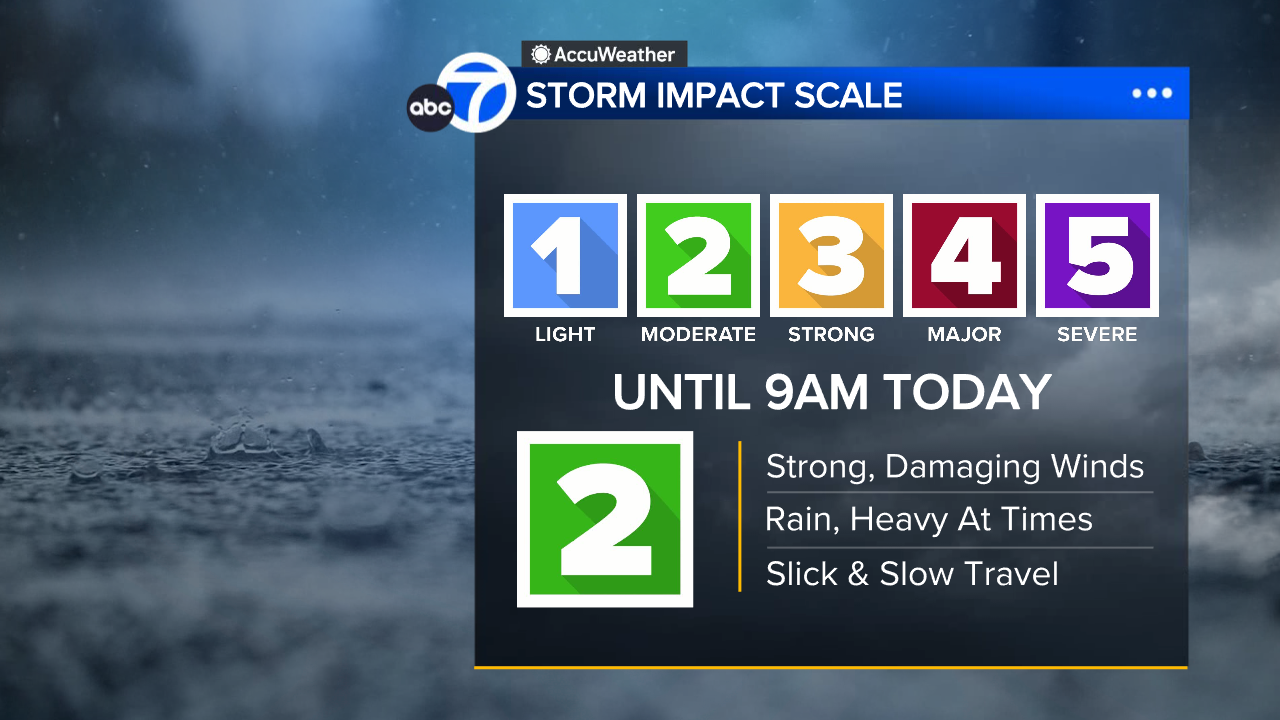 The storm is a level 2 on the ABC7 Exclusive Storm Impact Scale until 9 a.m. and will drop to a level 1 for the rest of the day.