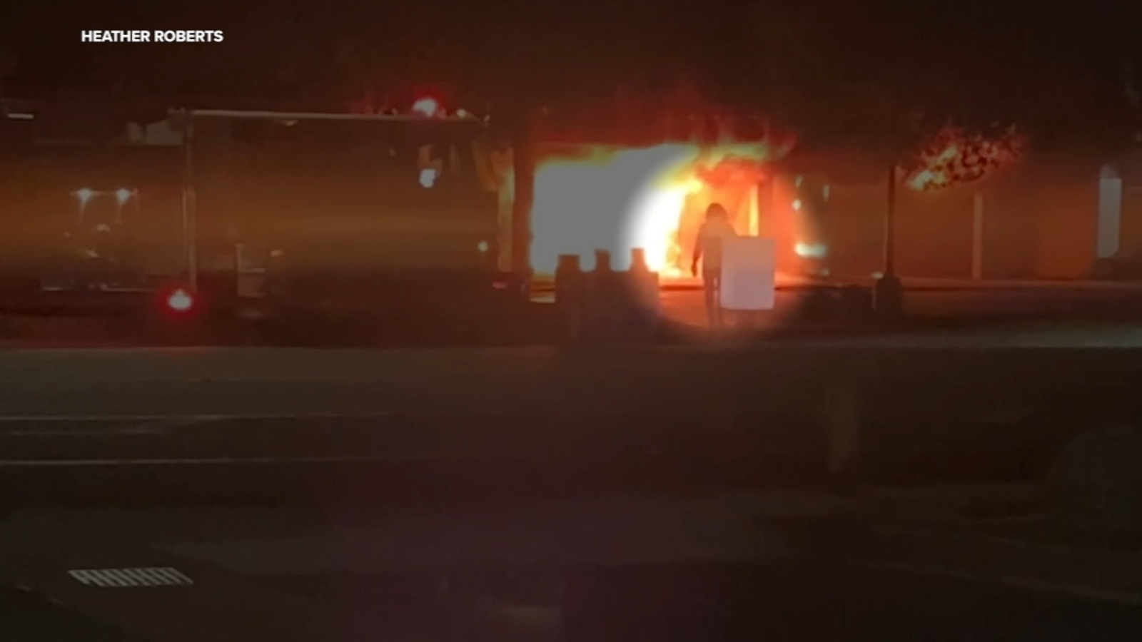 Video from a neighbor shows a person standing in front of the building engulfed in flames.