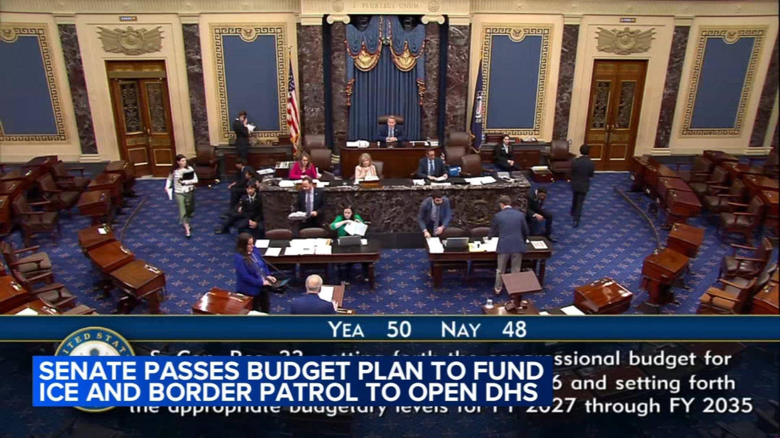 WASHINGTON -- The Senate took the first steps in a new effort to reopen the Department of Homeland Security early Thursday, voting to adopt a budget plan that would fund ICE and Border Patrol over Democratic objections and sending it to the House.