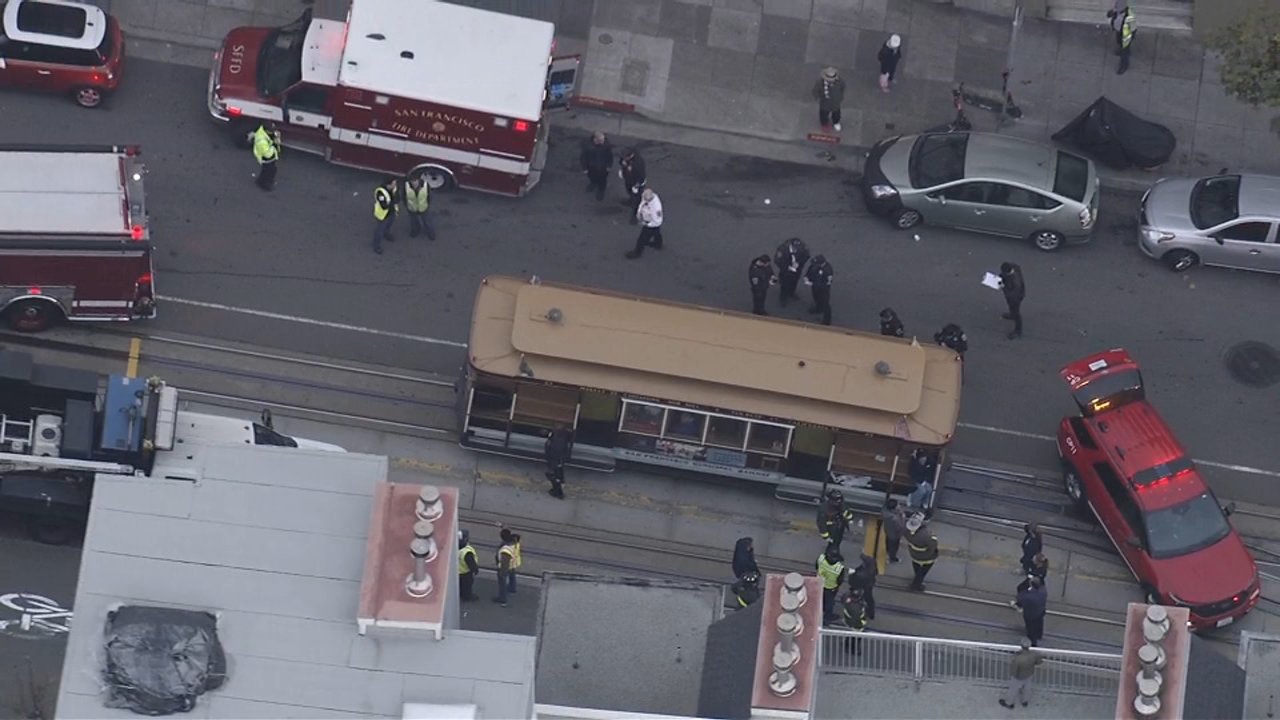 SAN FRANCISCO (KGO) -- At least 13 people were injured after a cable car came to a sudden stop in San Francisco on Monday, according to San Francisco fire officials. SKY7 video shows shattered glass on the window.