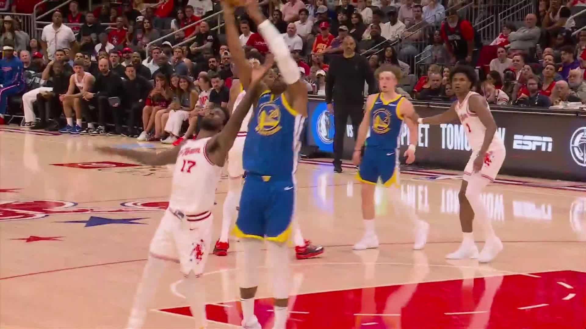 The Warriors won the jump ball and called a timeout, but Gui Santos turned the ball over with 0.3 seconds remaining before Thompson missed a shot under the basket to send it to overtime.