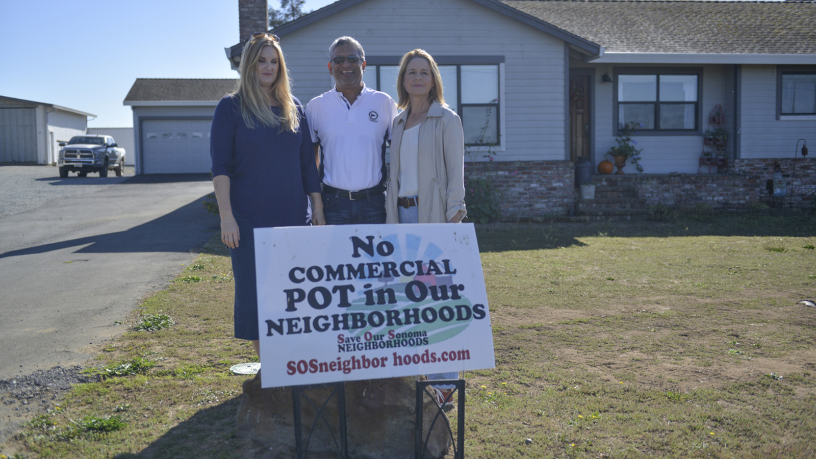 "I can smell it. I can see it." The signs in front of Britt Christiansen's home, and others, tell the story of a neighborhood's suspicions about Sonoma Hills Farm, where they claim the new owners have already begun commercial cannabis operations and tours before receiving the county permit, for which they have applied.