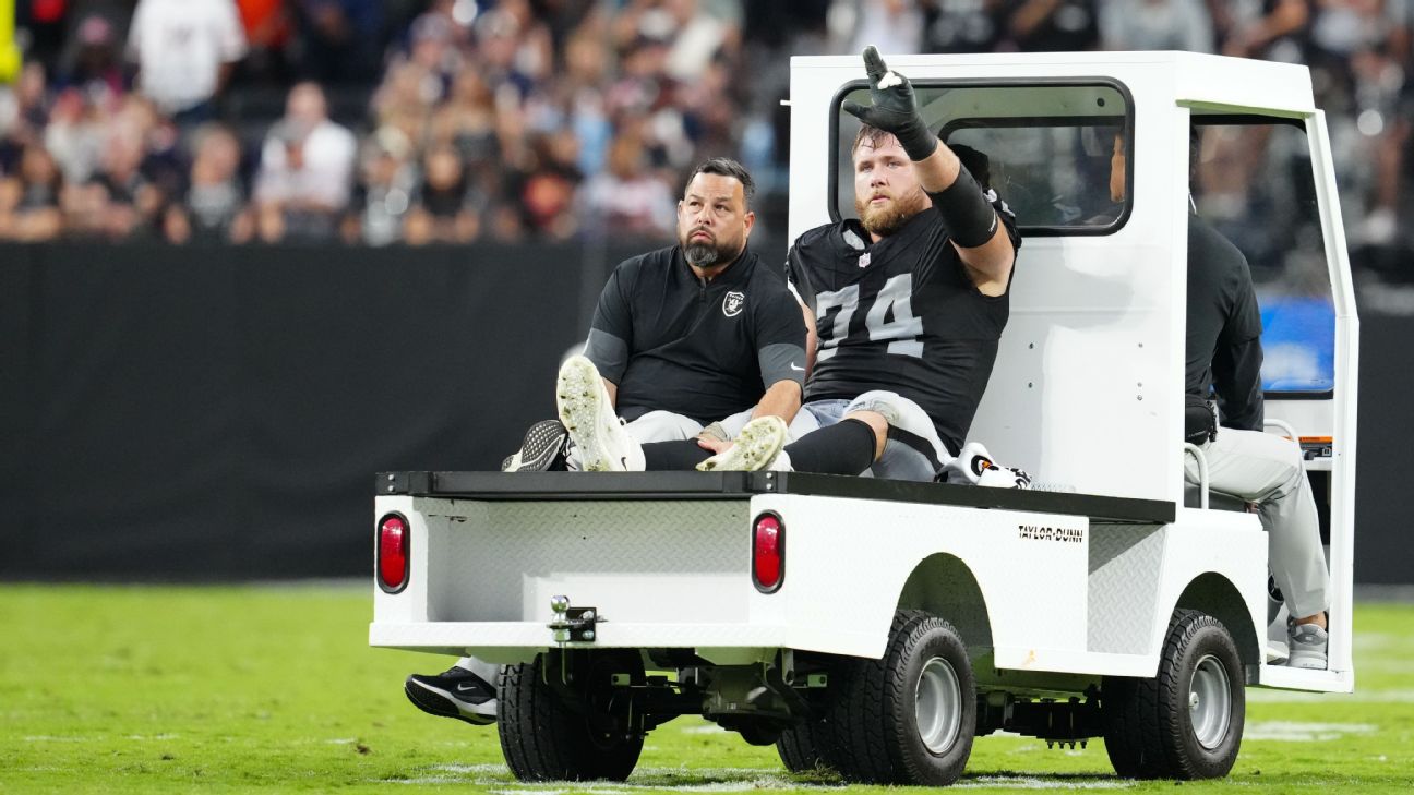 HENDERSON, Nev. -- Las Vegas Raiders starting left tackle Kolton Miller suffered a high ankle sprain and a hairline fracture in Sunday's 25-24 loss to the Chicago Bears, a source confirmed to ESPN.