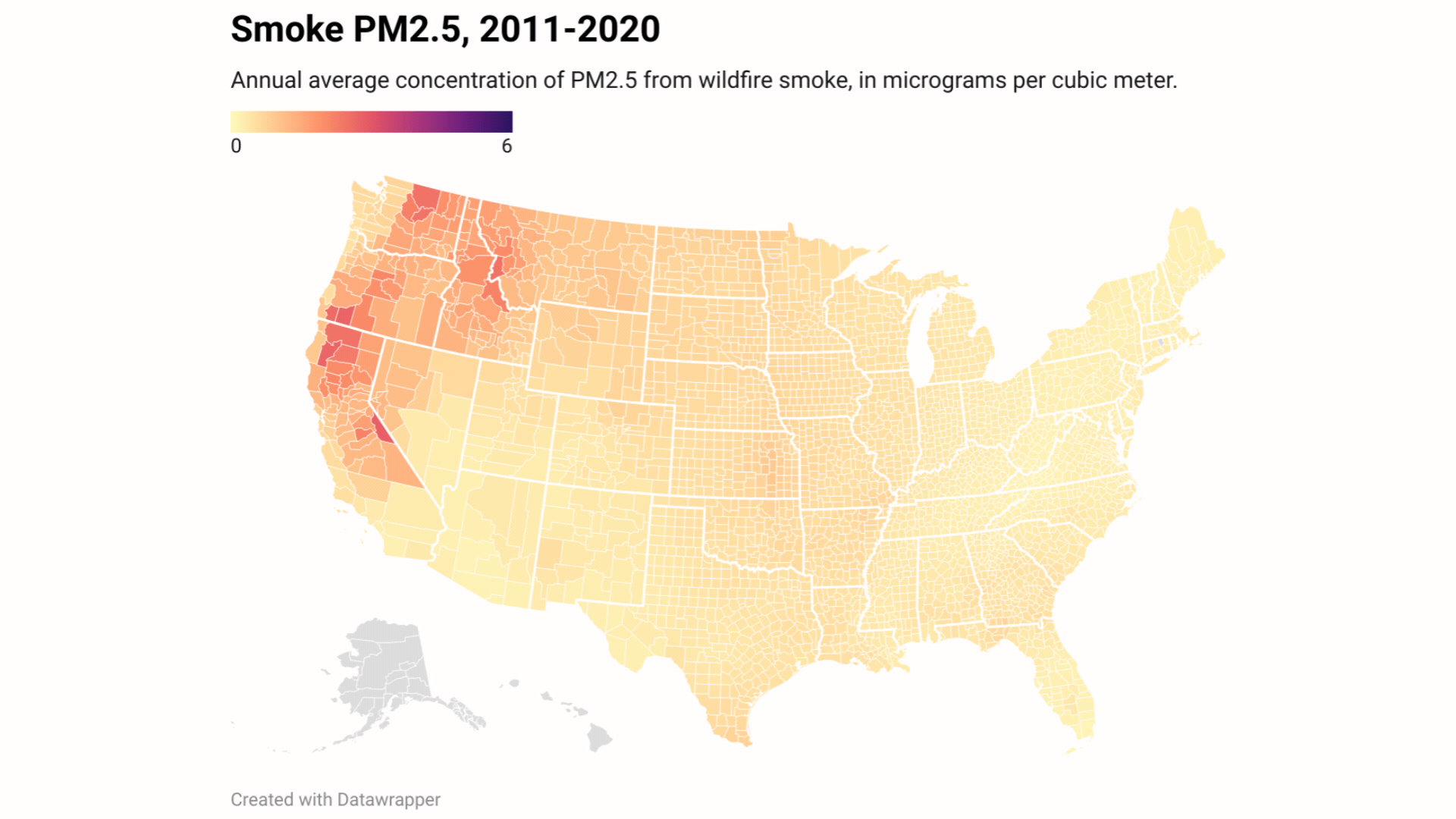 The largest increase in smoke exposure deaths would be in California, projected to be 5,000 of the 70,000 excess deaths. While those who live in the vicinity of a burning wildfire are clearly impacted, people even thousands of miles away can be too.