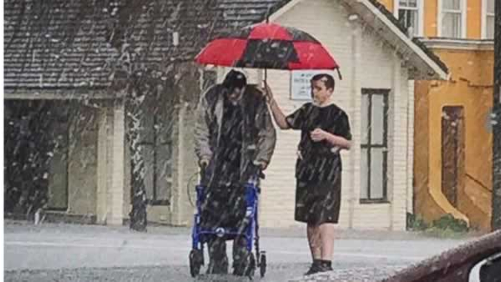 He ran outside with an umbrella from his dad's restaurant, Gracie's to help the man cross the street.
