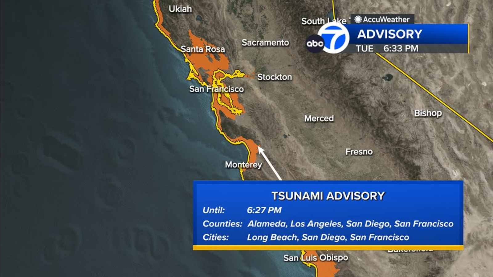 SAN FRANCISCO -- The National Tsunami Warning Center has issued a Tsunami Advisory for the California Coast on Tuesday evening, including coastal areas spanning from Mendocino to Monterey counties.