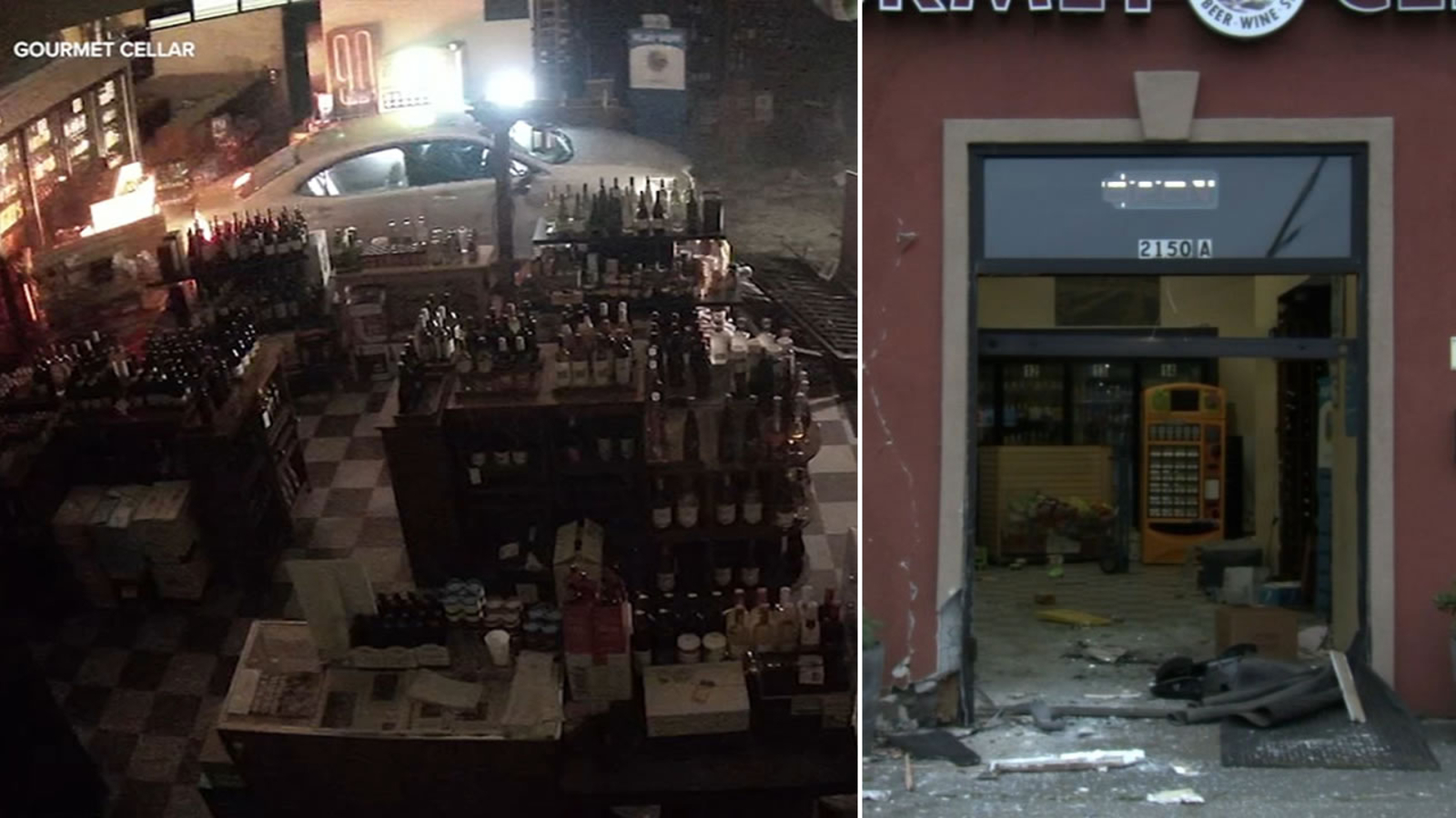 Security camera footage from inside and outside of San Leandro's Gourmet Cellar shows the moment a car backed into the liquor store around 3:45 a.m.