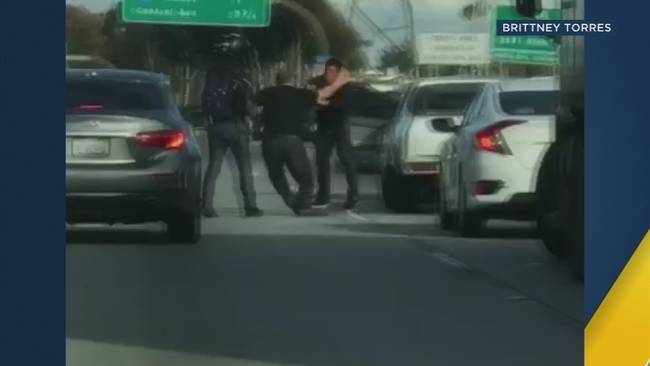 SOUTH LOS ANGELES -- Two men broke out into a fight in the eastbound lanes of the 105 Freeway in South Los Angeles Wednesday and the tussle was caught on video.