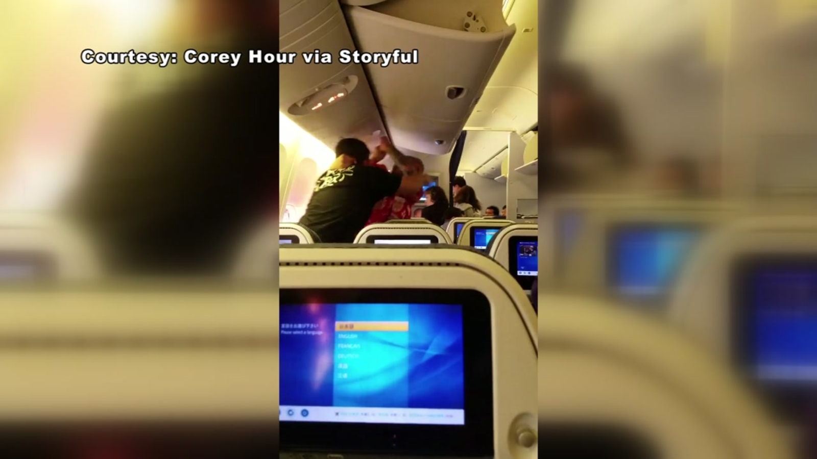 Two passengers got into it before the plane took off from the Narita International Airport on Monday. Flight attendants intervened to break up the fight, but one man walked away for a moment, then turned around and started to throw more punches.