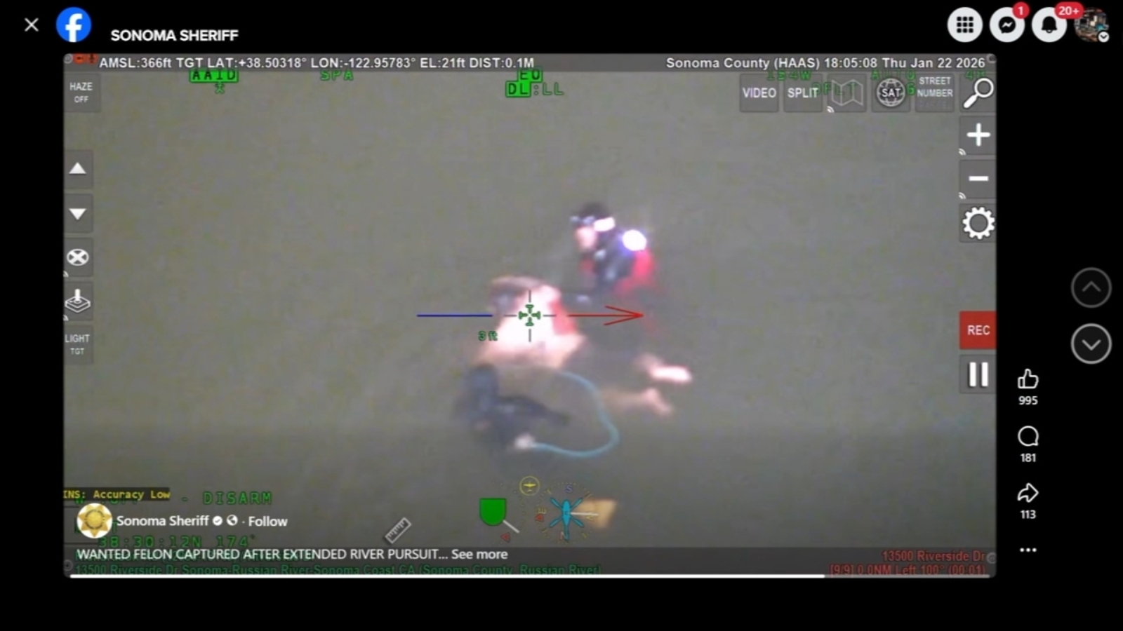 Deputies said the suspect fled from a vehicle in the 11800 block of River Road and ran toward the Russian River, swimming across and attempting to hide near the 13000 block of Riverside Drive. The chase stretched for more than an hour as the suspect repeatedly swam west in the river, climbed out and re-entered the water in an effort to avoid capture.