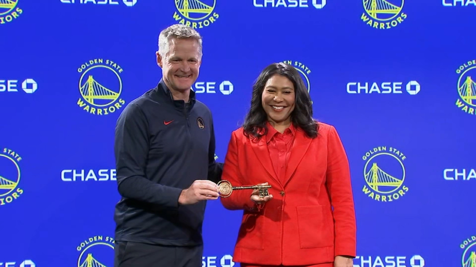 SAN FRANCISCO (KGO) -- Outgoing San Francisco Mayor London Breed held one of her last official acts in office on Friday, giving Warriors coach Steve Kerr the key to the city.